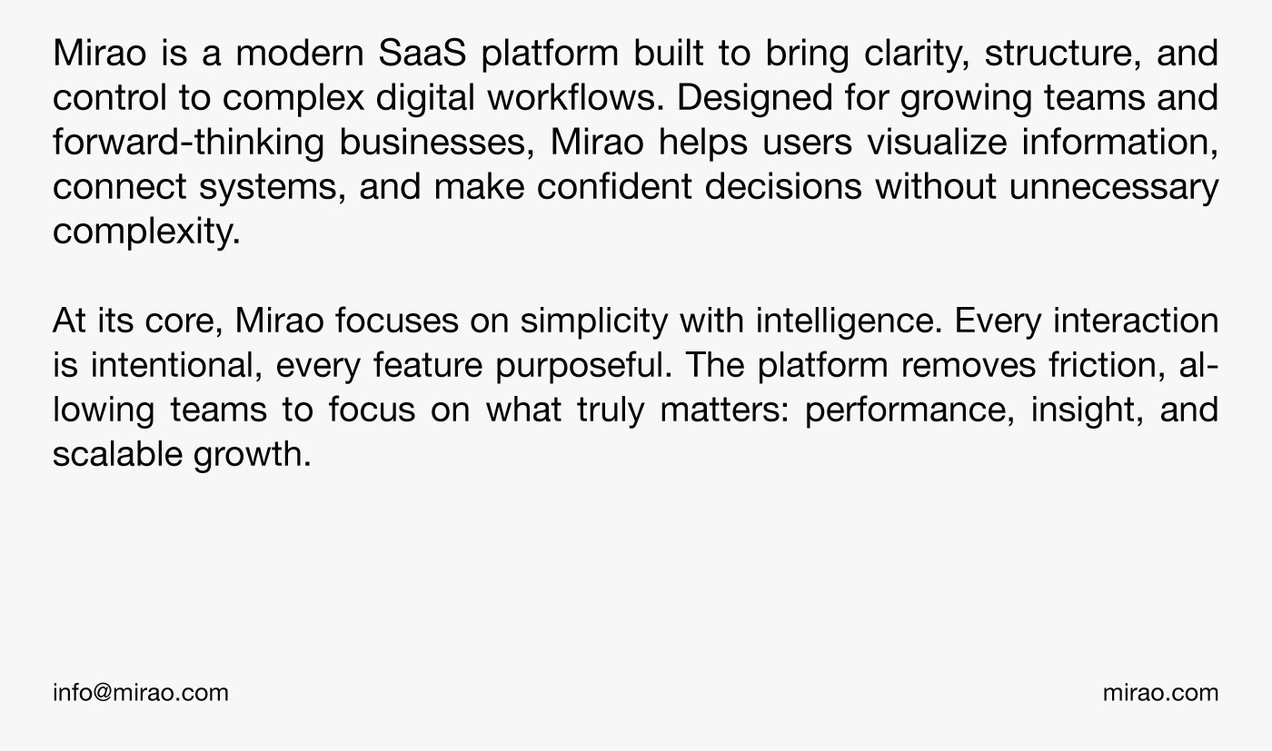 Mirao is a modern SaaS brand created to help businesses work with clarity and confidence. The goal of this project was to design a visual identity that feels professional, trustworthy, and scalable across digital products.